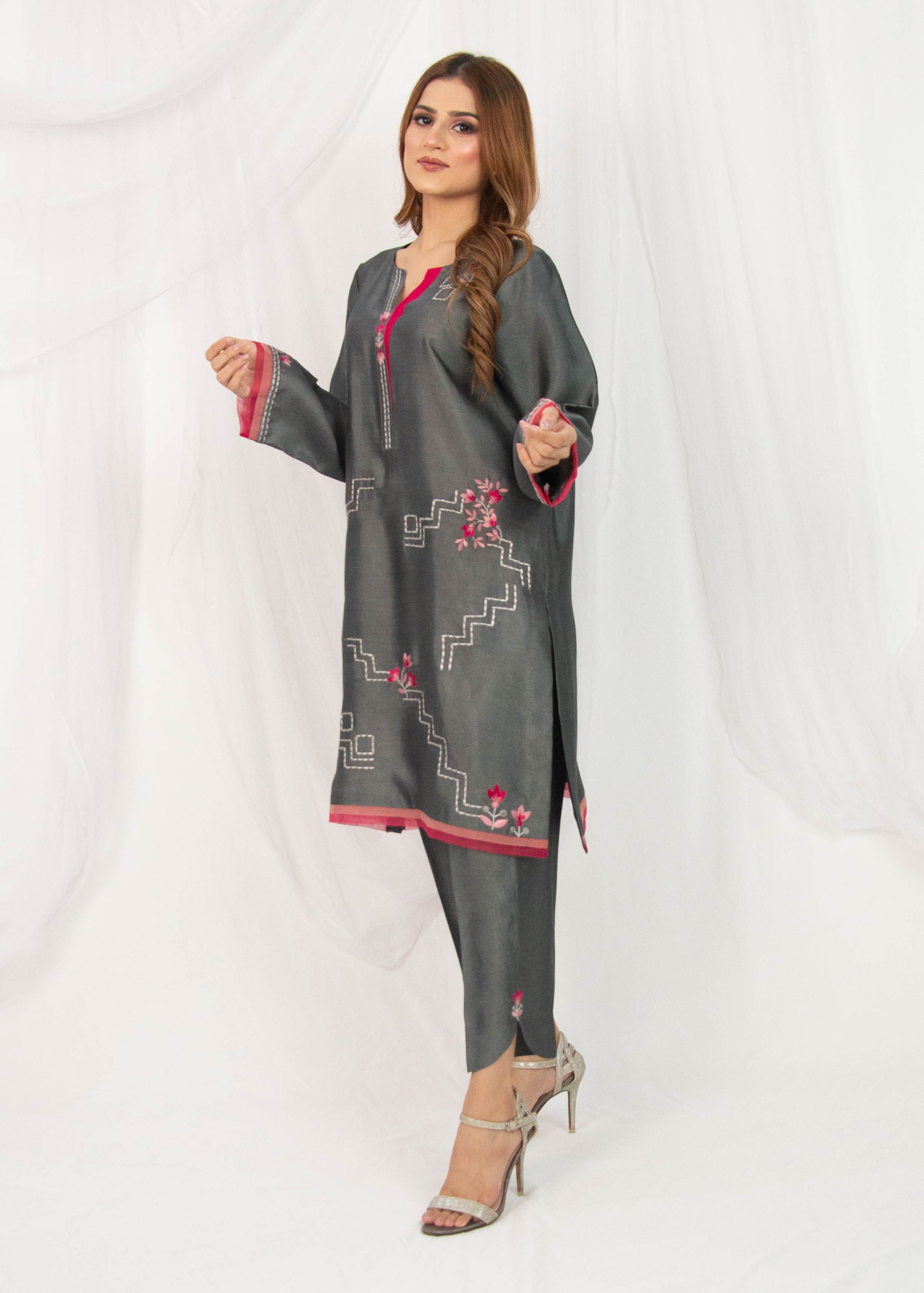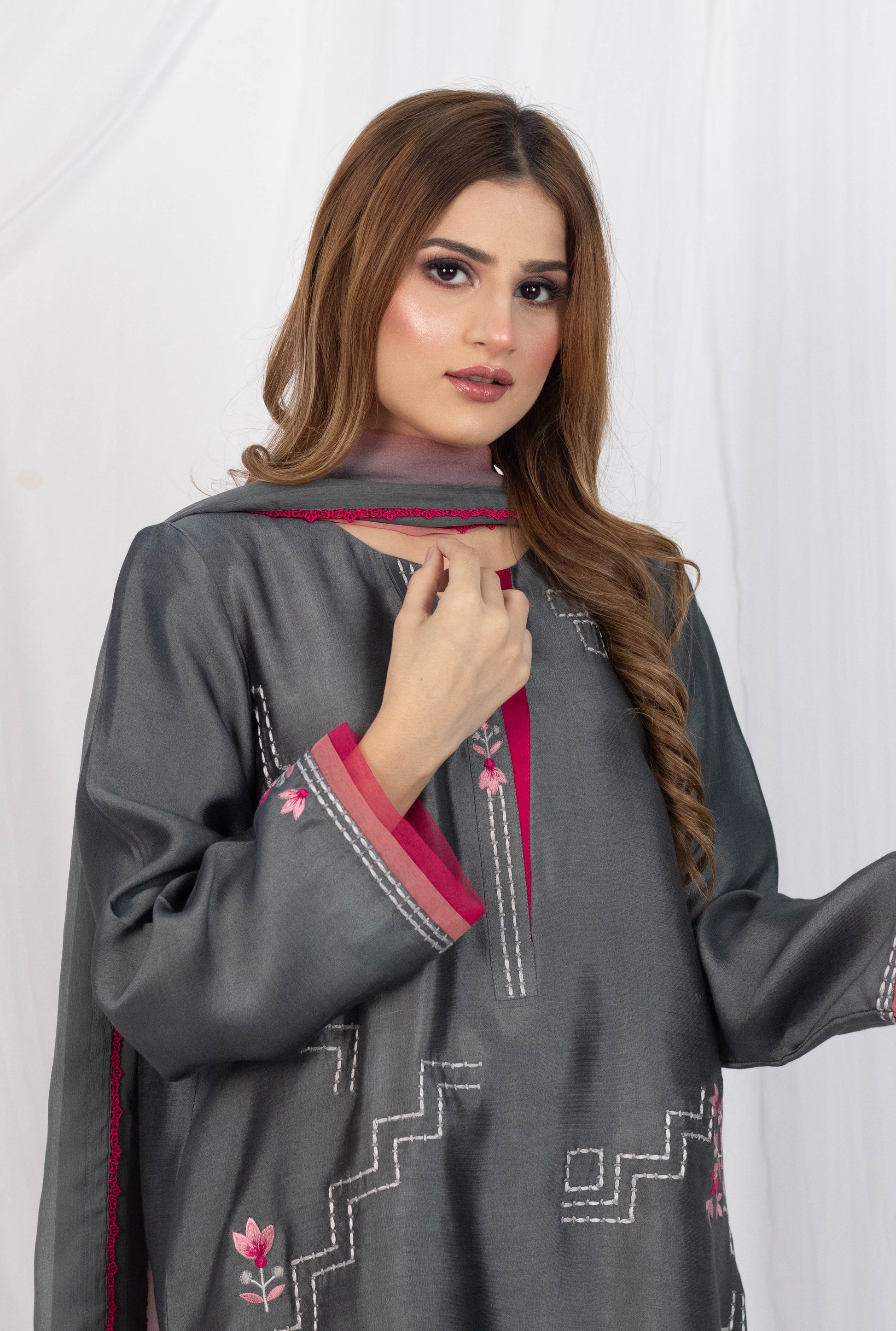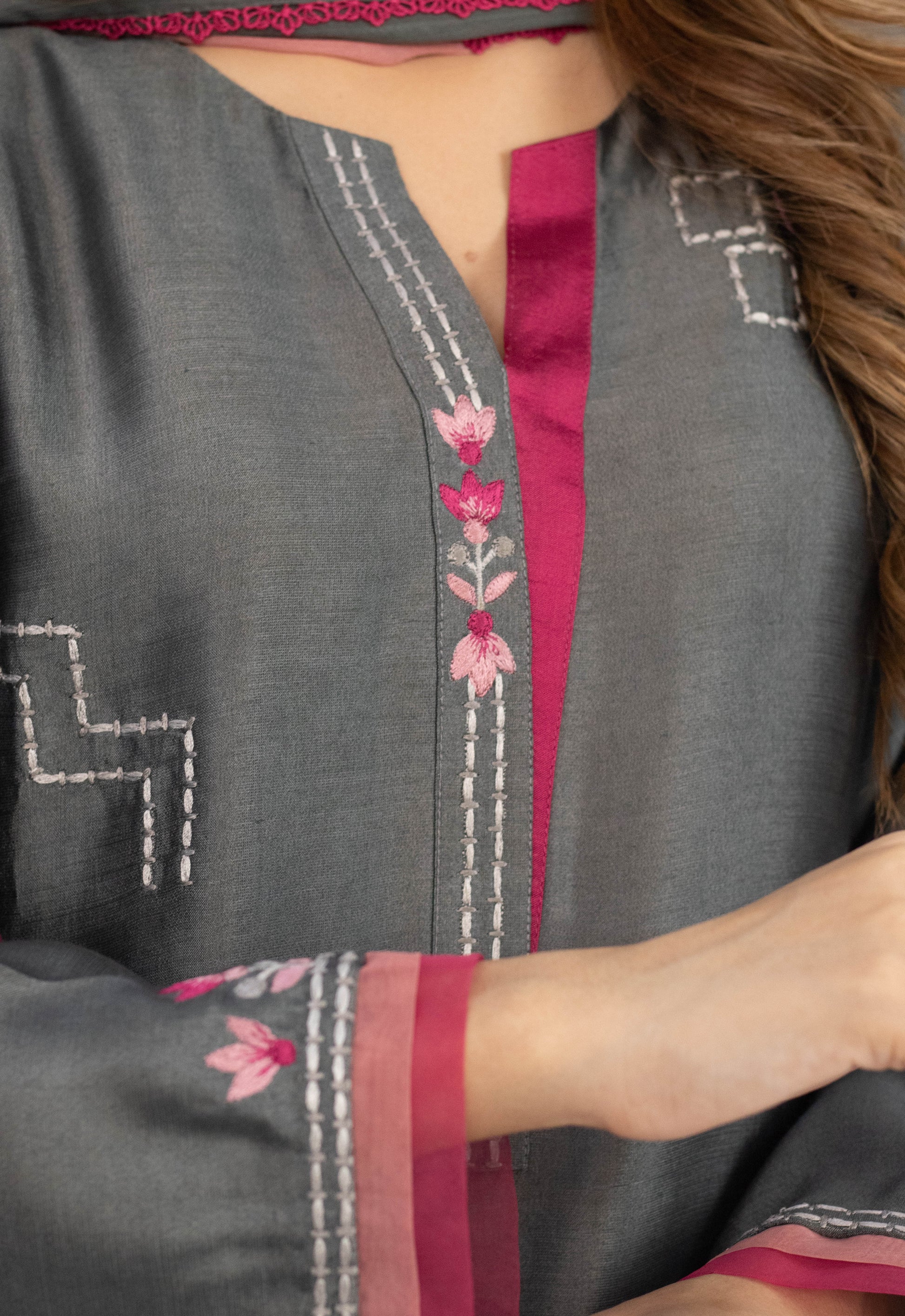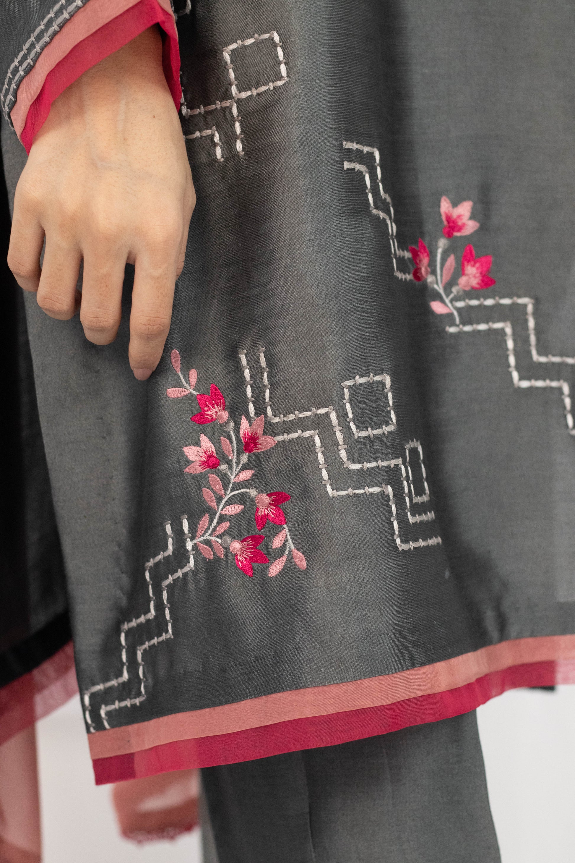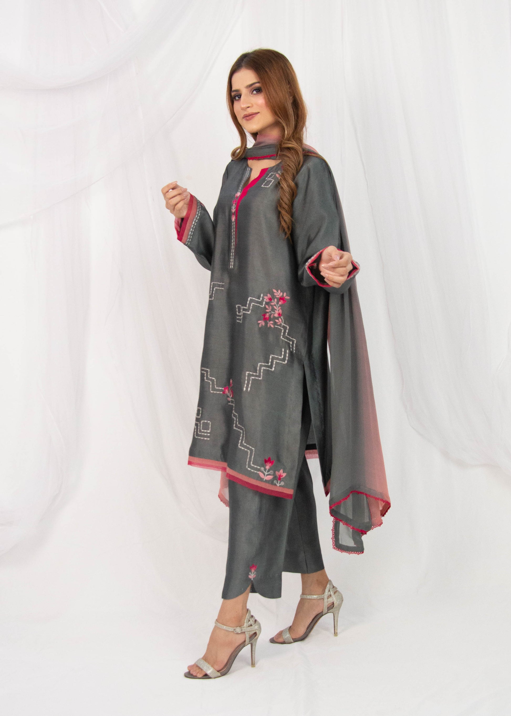 Crafted in a deep charcoal hue, this ensemble is elevated with detailed threadwork and hints of vivid pink organza that add a refined contrast. The look is completed with embroidered trousers and a two-tone dyed dupatta featuring delicate lace borders — a modern classic with a pop of color.