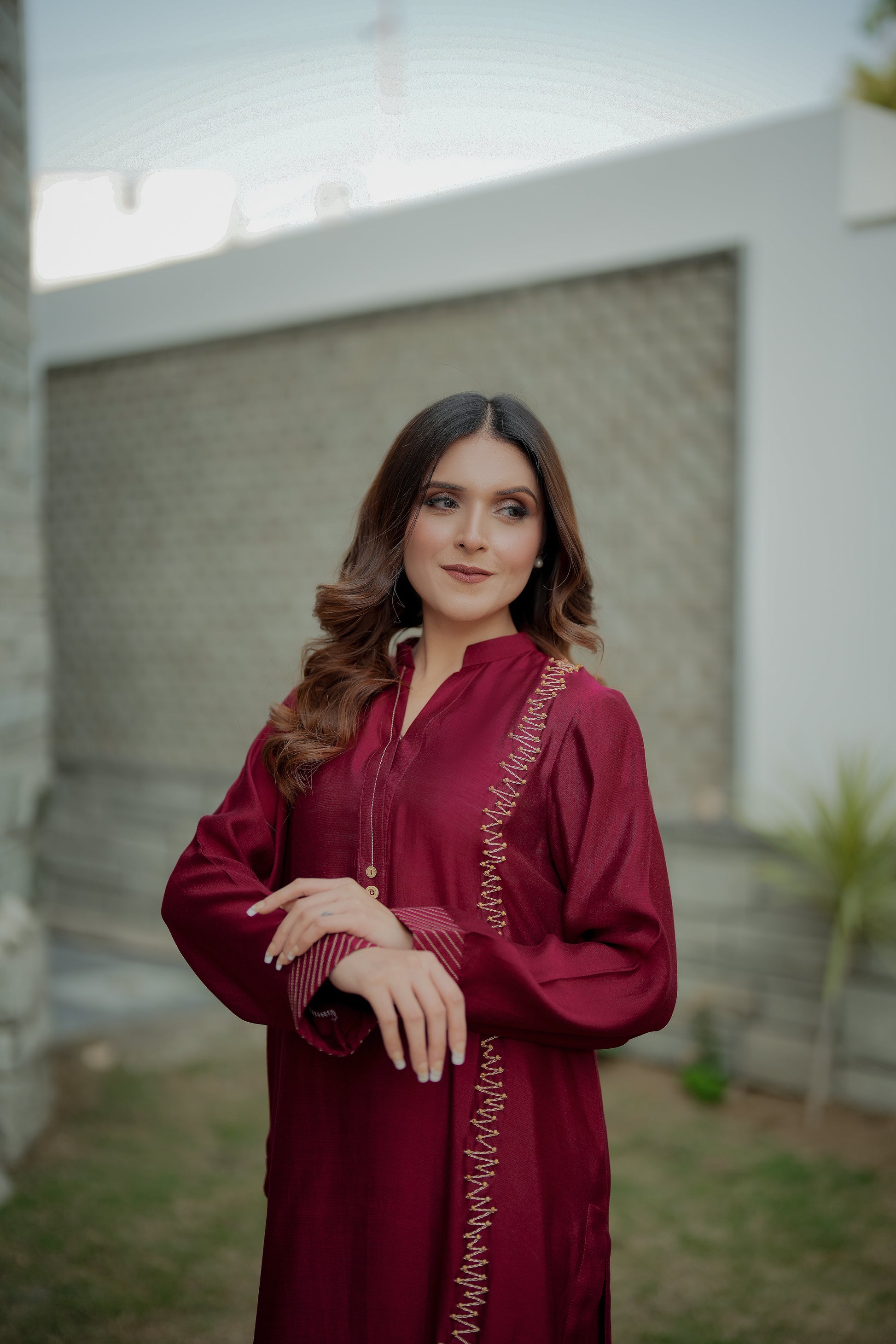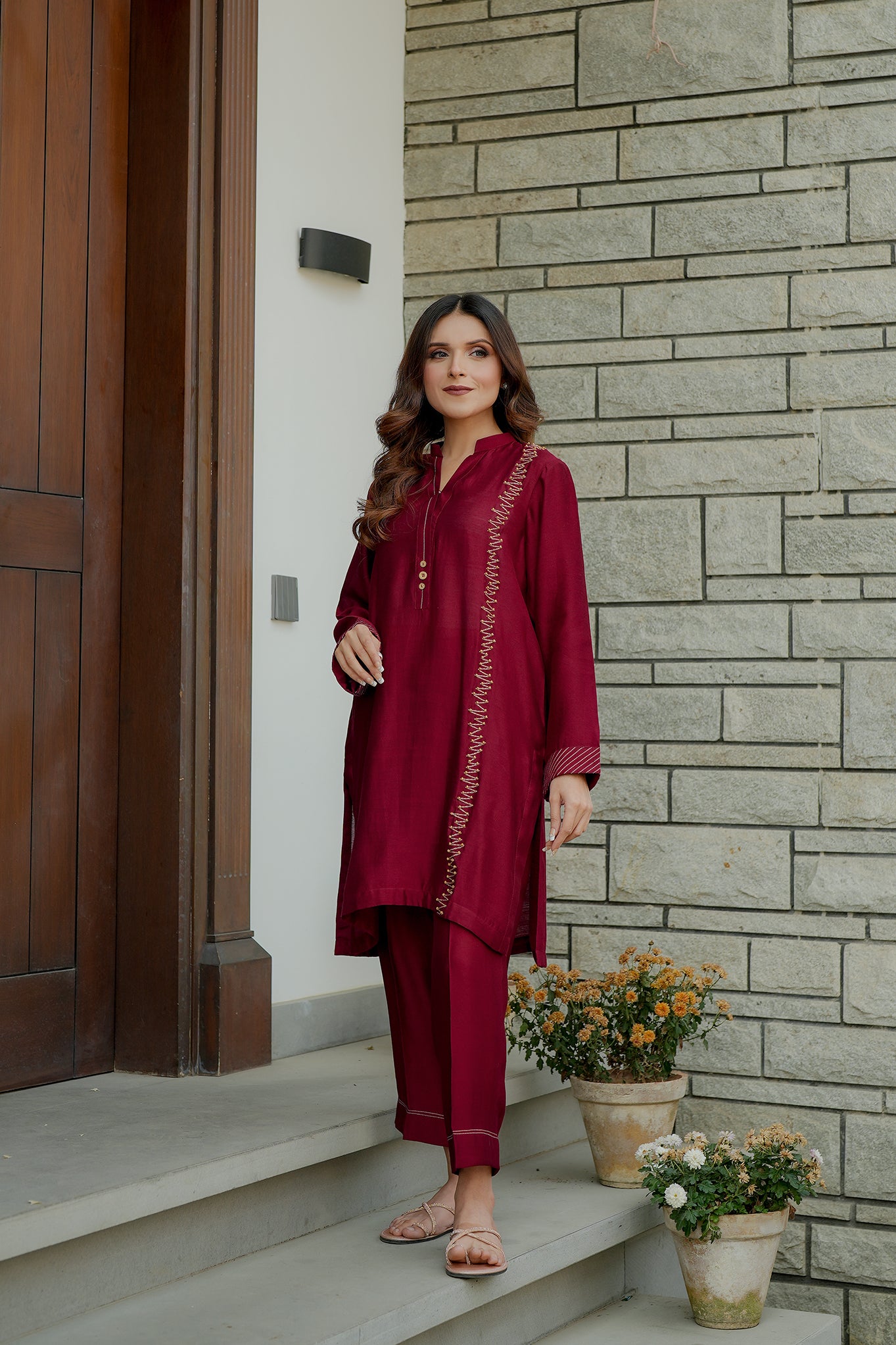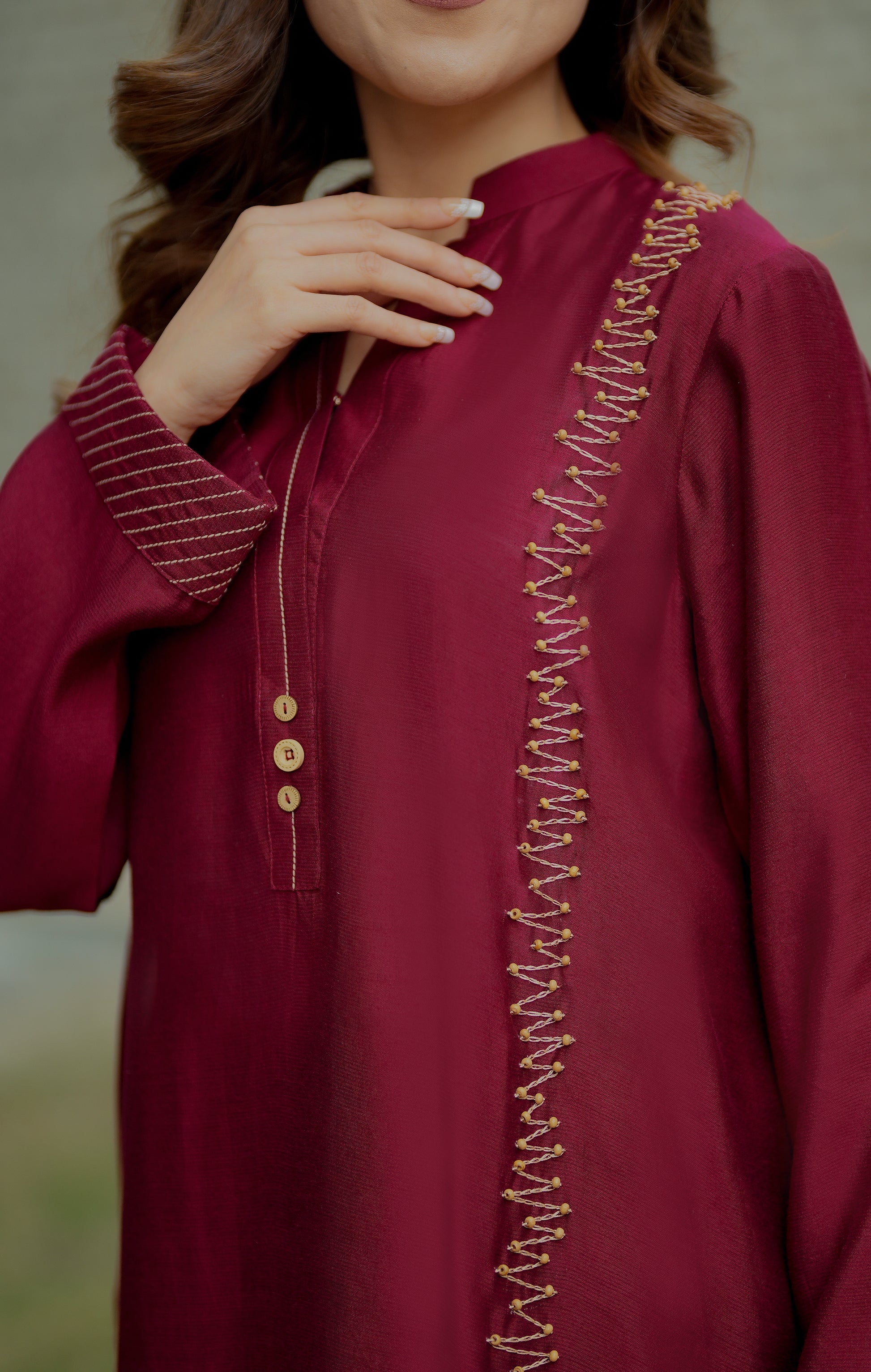 A refined maroon cord set crafted with delicate handwork detailing. Featuring intricate bead embellishments along the front panel, this ensemble blends minimal design with artisanal charm. The straight-cut silhouette and clean neckline create an effortlessly graceful look, perfect for elevated everyday wear or intimate gatherings.